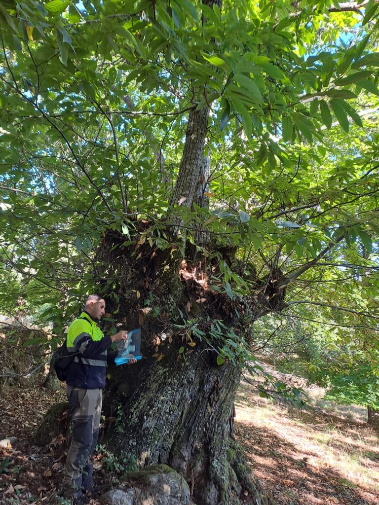 3. Medición diametral: Se mide el diámetro de los troncos de los castaños seleccionados. Estos datos permiten evaluar el crecimiento y vigor de los árboles, así como su potencial productivo.